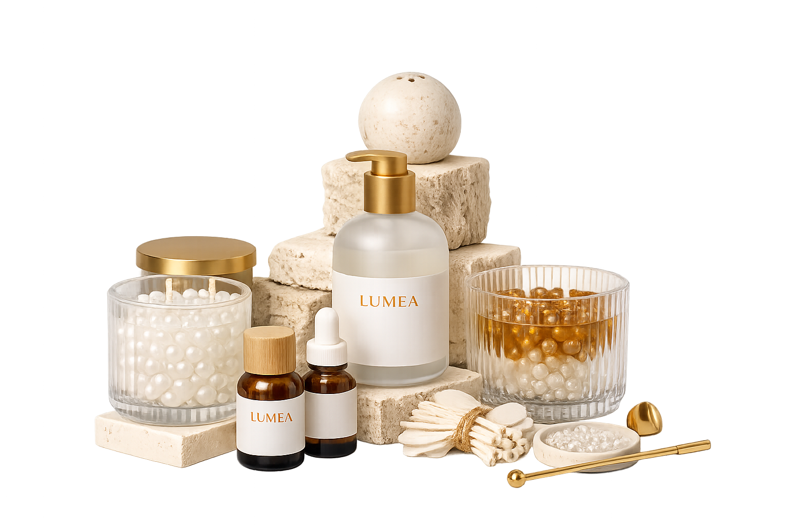 El kit inicial de LUMEA incluye todo lo necesario para empezar: un recipiente de diseño, perlas, mechas y la base del sistema para que después solo tengas que recargar y seguir transformando tu espacio.
