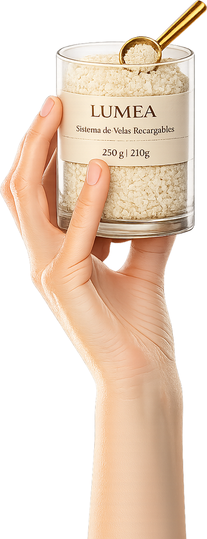 LUMEA funciona con un sistema de perlas y mechas intercambiables dentro de un recipiente reutilizable. Cuando querés renovarla, no cambiás toda la vela: simplemente recargás las perlas o reemplazás la mecha.